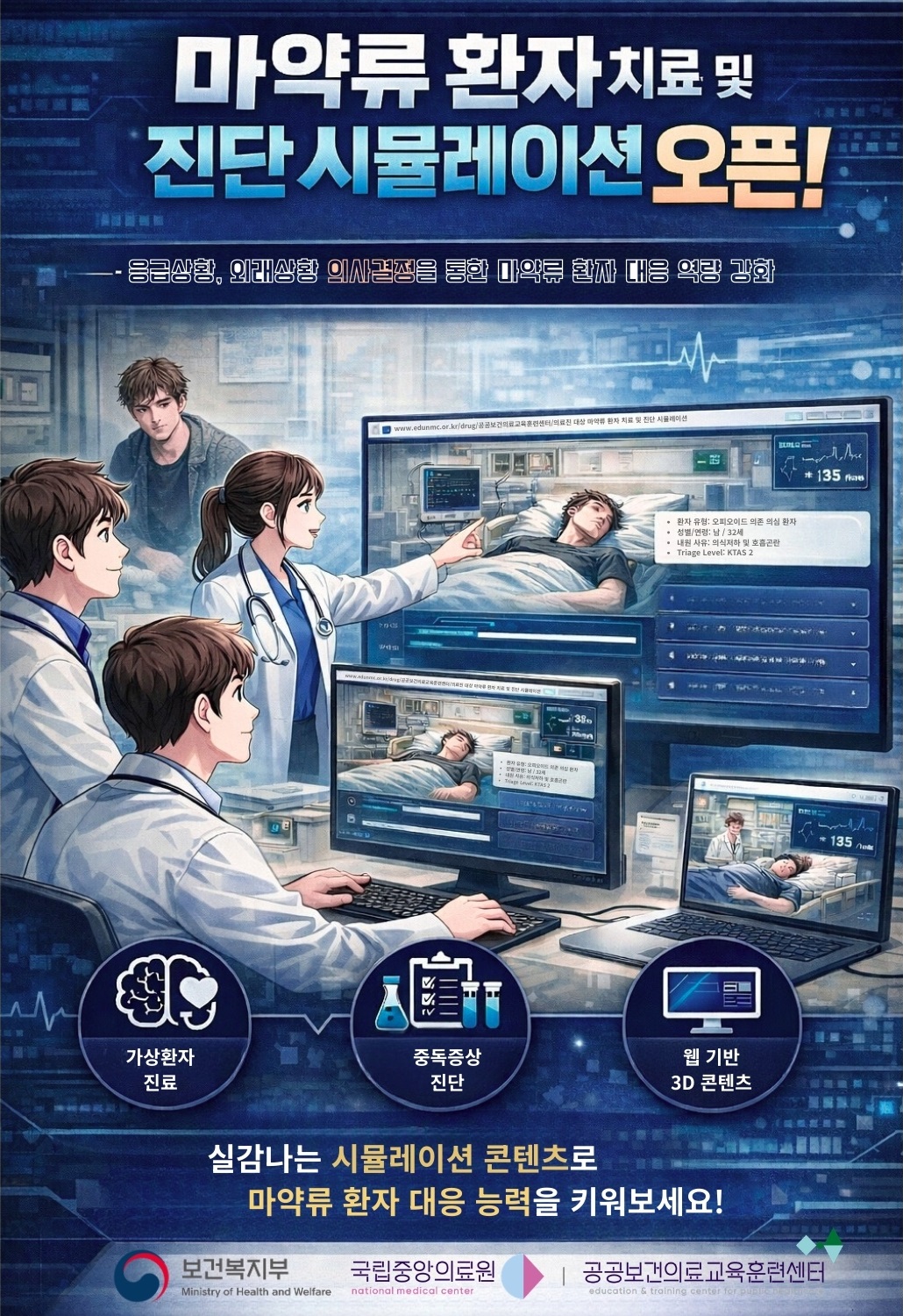 공공보건의료교육훈련센터는 오늘부터 네 번째 가상환경 실감형 콘텐츠인 「의료진 대상 마약류 환자 치료 및 진단 시뮬레이션」을 정식 오픈하였습니다. 최근 급증하고 있는 마약류 중독 문제에 대응하여, 공공의료기관 의료진이 임상 현장에서 실제로 적용 가능한 치료·진단·재활 역량을 체계적으로 학습할 수 있도록 개발된 웹 기반 실감형 시뮬레이션 콘텐츠입니다.